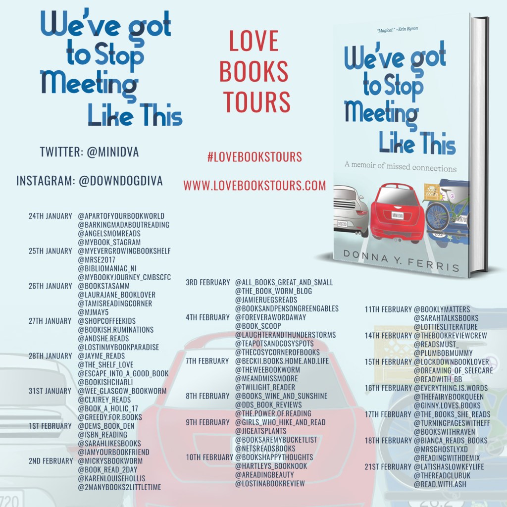 Donna Y. Ferris lives in West Chester, PA with her husband and dogs – and spends as much time as possible with her two Musketeers in Pittsburgh (the home of her beloved Steelers). We’ve Got to Stop Meeting Like This – A Memoir of Missed Connections is her first book. Donna continues to work in corporate America and has contributed over thirty articles to Elephant Journal. She also teaches yoga weekly, workshops quarterly, and leads Spring / Fall retreats in Duck, NC. Donna can be reached via email (donnayferris@minichangeyoga.com) or on Facebook and Instagram (@downdogdiva) and Twitter (@minidva).