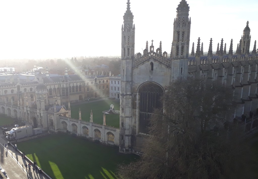 This is a view of King’s College, Cambridge, showing the front court and chapel. I took it from the tower of the university church, Great St Mary’s. If you look next to the college’s gatehouse, you can see the BBC outside broadcasts lorry. Its crew were getting ready for the live radio transmission of the carol service on 24th December. But for me, this day was particularly special as it was my 50th birthday! As you can see, the weather was beautifully sunny. I had my husband and daughter with me, and was also eagerly anticipating the arrival of my son, later that day, so I was happy.
