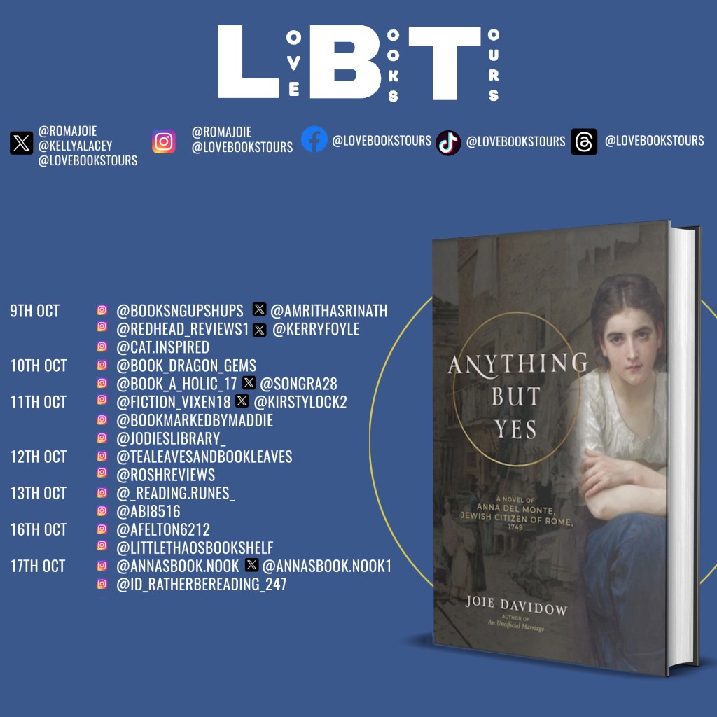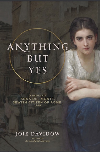 Even in Rome, very few people know the story of the Ghetto or the abduction of Jews, the story of popes ever more intent on converting every non-Catholic living in the long shadow of the Vatican. Young girls and small children were the primary targets. They were vulnerable, easily confused, gullible. Anna del Monte was different. She was strong, brilliant, educated, and wrote a diary of her experiences. The document was lost for more than 200 hundred years, then rediscovered in 1989. Anything but Yes is also based on Davidow’s extensive research on life in the eighteenth-century Roman ghetto, its traditions, food, personalities, and dialect.