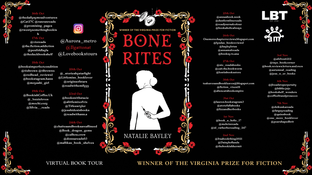 Natalie Bayley is the author of Bone Rites, Lolita’s Daughter, The Secret Life of Grandmothers, The Witch Who Saved Paris and The Lady Lyttle Murder Mystery series. Her dark thriller Bone Rites was selected for the 2019 Blue Pencil long list, went on to be shortlisted for the 2021 Blue Pencil First Novel Award and was long listed for the 2021 Caledonia Prize before becoming the Winner of the Virginia Prize for Fiction 2022.