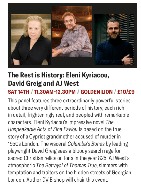 Step back in time with three incredible authors—Eleni Kyriacou, David Greig, and AJ West—who’ve masterfully brought history to life in their novels. If you love historical fiction, this is the panel for you!