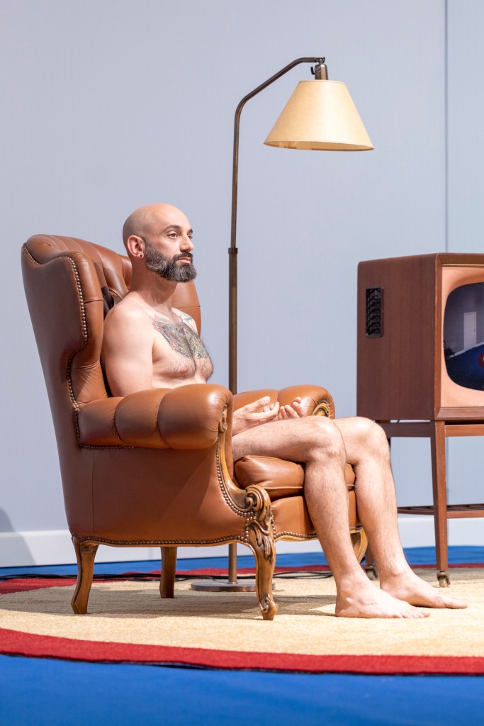 Dynamic and unsettling, the performance’s set erupts with striking video projections depicting an intense wrestling match between two men, an evocative metaphor for Constantinou’s internal battles. These visuals alternate with quiet stillness, mirroring the tension between silent endurance and inner chaos.