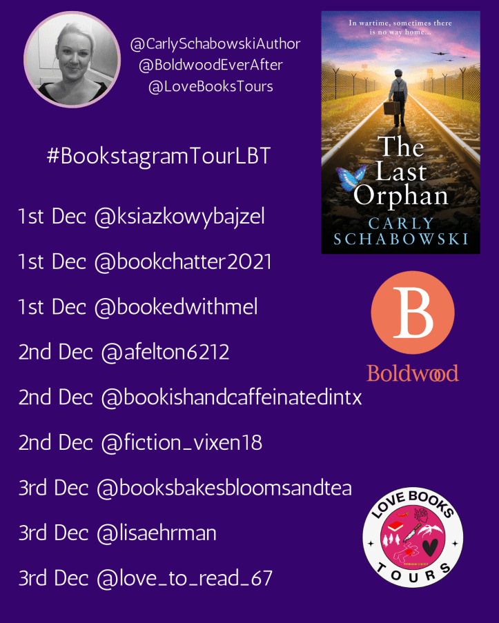 We’re thrilled to be partnering with Boldwood Books and USA Today bestselling author Carly Schabowski for a beautifully moving historical tour. Our wonderful hosts will be sharing their thoughts on The Last Orphan over three days — and we can’t wait for you to follow along.