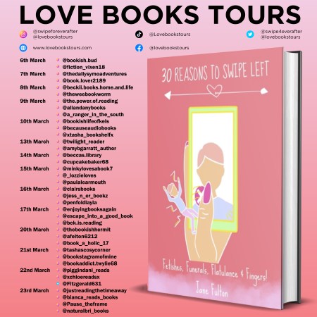 30 Reasons to Swipe Left by Jane Fulton #blogtour organised by @lovebookstours @KellyAlacey #Booktwitter #Bookreviews #VirtualBookTour #2023tour