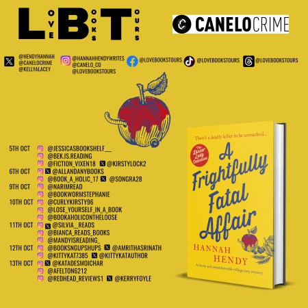 π Follow the #virtualbooktour for “A Frightfully Fatal Affair” by @HendyHannah!! π Join Margery and Clementine Butcher-Baker on a thrilling adventure in this Cosy Mystery. Oct 5th – 13th. ππ #DinnerLadyDetectives #Mystery #BookTour @CaneloCrime @lovebookstours