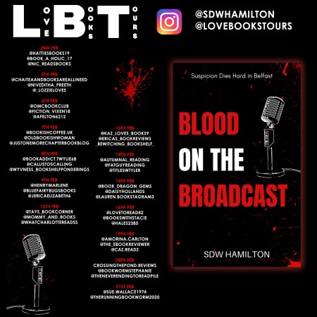 #Virtualbooktour | Blood on the Broadcast by SDW Hamilton @sdwhamilton87 | 2nd – 21st Feb 2024 | Proudly organised by @lovebookstours. #BookTour #LBTCrew #Bookreviews